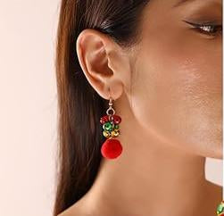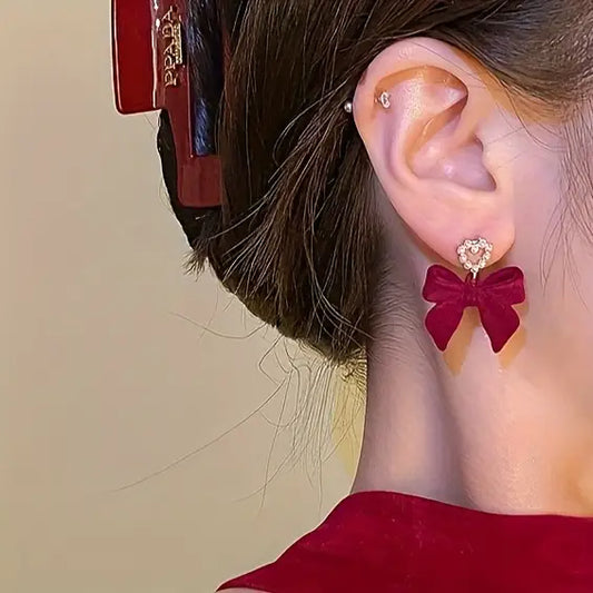 Burgundy Velvet Bow Tie Earrings with Heart-Shaped Imitation Pearls