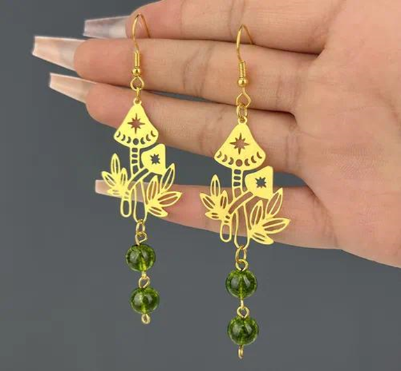Discover the magic of the Forest Witch earrings! This piece gives cottage core vibes and features mushrooms with celestial accents and two peridot green beads. Weightless design for all day wear