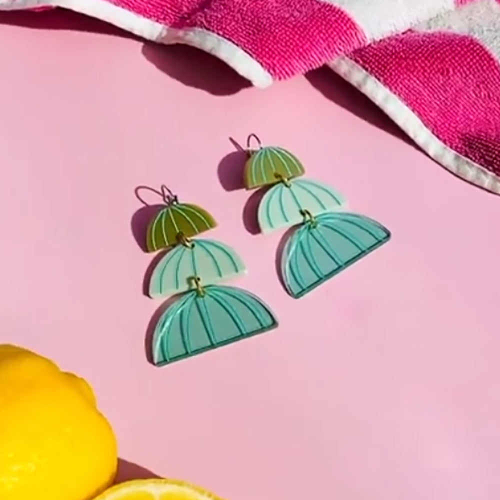Luxurious mottled acrylic half-circle earrings, with a mesmerizing pearlized gleam, in stunning green hues.