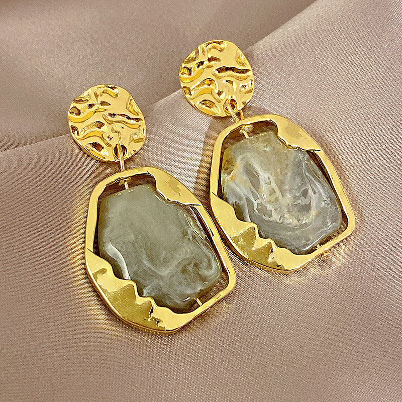 Sophisticated gold dangle with mesmerizing acrylic stones resembling tigers eye, imparting a stylish and bewitching charm.