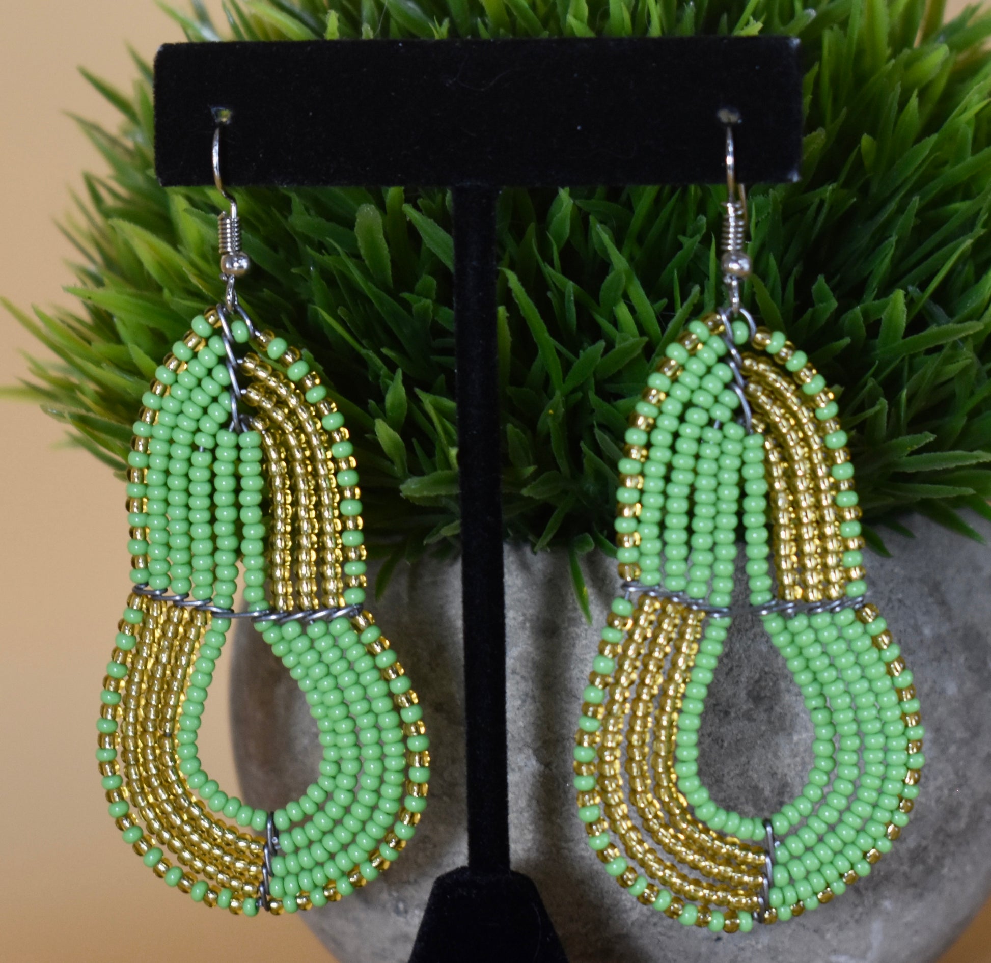 Beautiful green and gold beads, inspired by beaded jewelry worn in Africa.