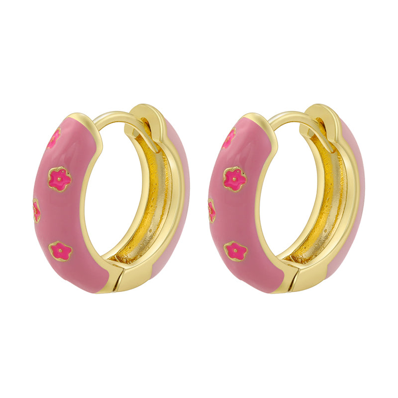 These mini huggie-hoop earrings feature delicate enamel flowers in shades of pink, adding a touch of femininity to any outfit.