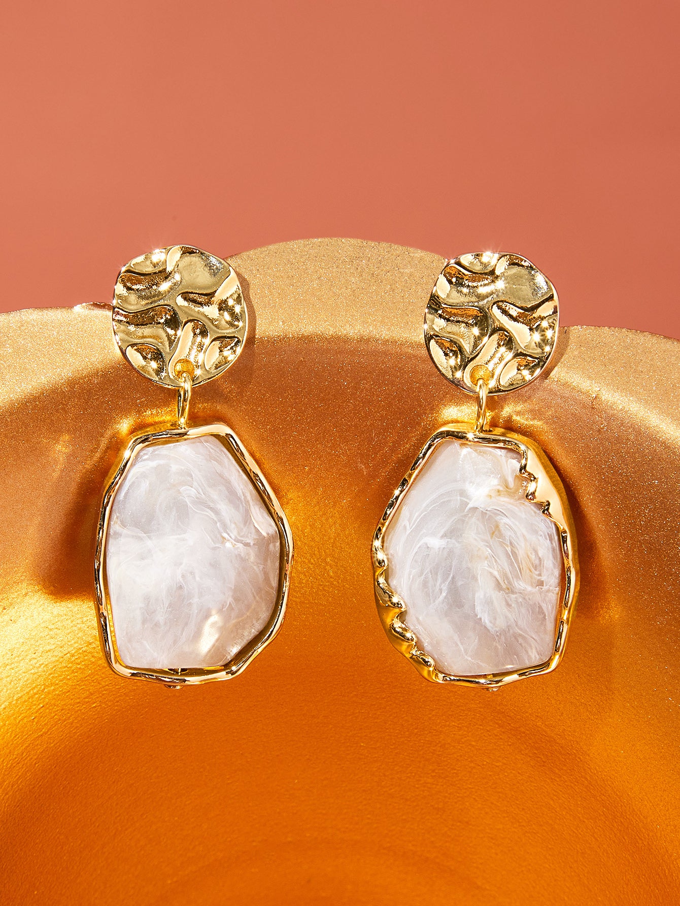 Sophisticated gold dangle with mesmerizing acrylic stones resembling tigers eye, imparting a stylish and bewitching charm.