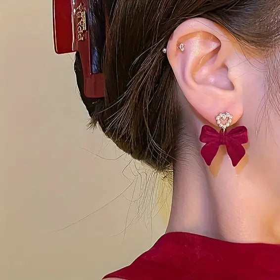 Burgundy Velvet Bow Tie Earrings with Heart-Shaped Imitation Pearls.